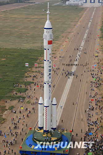 這是轉(zhuǎn)運(yùn)現(xiàn)場。 9月20日15時(shí)15分,神七載人飛船、長征二號F運(yùn)載火箭和逃逸塔組合體,順利垂直轉(zhuǎn)運(yùn)至發(fā)射區(qū),標(biāo)志著神七任務(wù)已進(jìn)入最后的發(fā)射準(zhǔn)備階段。 新華社記者 李剛 攝