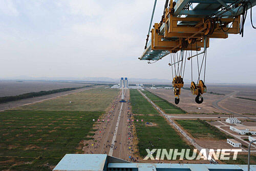 這是轉(zhuǎn)運現(xiàn)場。 9月20日15時15分,神七載人飛船、長征二號F運載火箭和逃逸塔組合體,順利垂直轉(zhuǎn)運至發(fā)射區(qū),標(biāo)志著神七任務(wù)已進(jìn)入最后的發(fā)射準(zhǔn)備階段。 新華社記者 李剛 攝