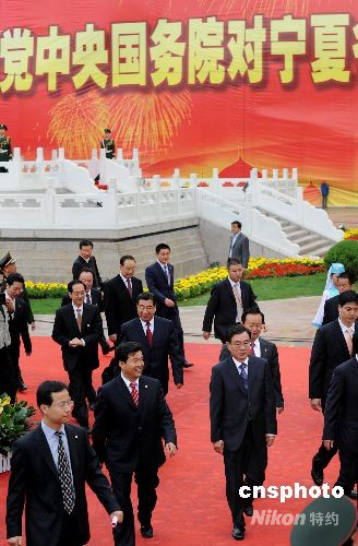 9月22日,中共中央政治局常委、中央紀委書記、中央代表團團長賀國強等,在銀川出席中央政府向寧夏回族自治區(qū)贈送民族團結寶鼎儀式。當日上午,以賀國強為團長的中央代表團乘專機抵達銀川,參加寧夏回族自治區(qū)成立50周年慶;顒印V行律绨l(fā) 廖攀 攝