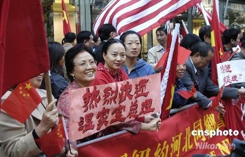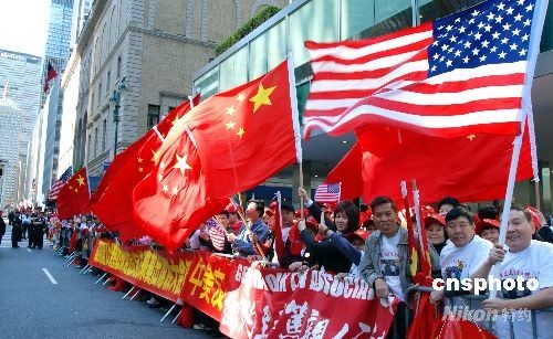 中國(guó)總理溫家寶于23日上午乘專機(jī)抵達(dá)紐約,當(dāng)?shù)財(cái)?shù)千華僑華人一早即聚集在他下榻的酒店附近夾道歡迎。中新社發(fā) 鄧悅 攝