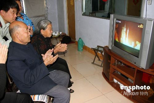 9月25日晚,“神七”發(fā)射場總指揮、中國酒泉衛(wèi)星發(fā)射中心主任崔吉俊將軍79的父親崔延璜、80歲的母親門方蘭正通過電視直播觀看“神七”發(fā)射。當日21時10分,神舟七號飛船順利發(fā)射成功。家住山東省無棣縣干休所的崔延璜、門方蘭兩位老人一直守候在電視機旁觀看“神七”發(fā)射實況轉播,“神七”升空瞬間,兩位老人情不自禁地熱烈鼓掌,祝賀中國航天事業(yè)又創(chuàng)造了一項偉大的壯舉。中新社發(fā) 陳子慶 攝