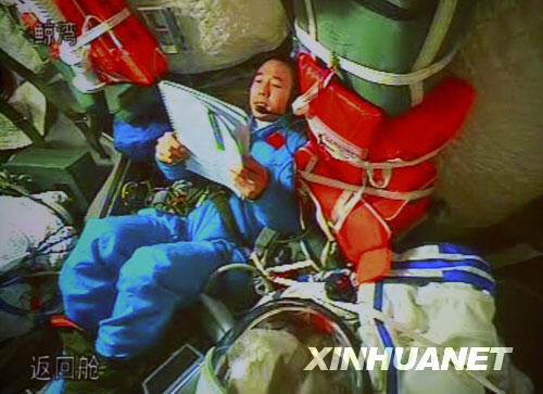 9月26日,航天員景海鵬在神舟七號載人飛船返回艙內(nèi)與北京飛控中心通話(攝于北京航天飛行控制中心大屏幕)。25日發(fā)射成功的神舟七號載人飛船運行正常。新華社記者 查春明 攝