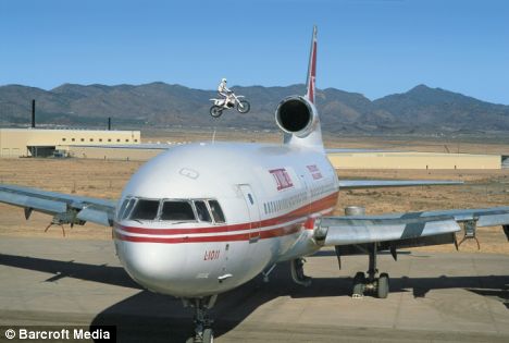 特技人道格駕駛一輛摩托車以時速每小時73英里的速度,精確地從一架翼展達(dá)48.8米的飛機上飛過,并成功地降落在一個長36.6米的斜坡上。