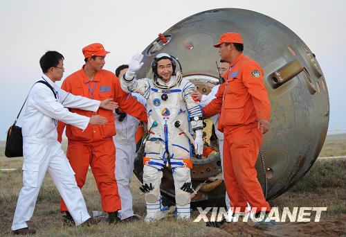 9月28日,神舟七號飛船返回艙順利著落,三名航天員翟志剛、劉伯明、景海鵬在經(jīng)過15-20分鐘的重力再適應(yīng)后全部出艙。首先出艙的是翟志剛,第二個出艙的是劉伯明,第三個出艙的是景海鵬。 在出艙后三位航天員接受了記者簡單的采訪。