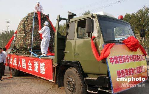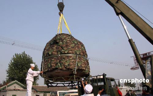 9月30日下午,神舟七號載人飛船返回艙乘專列由內蒙古運抵北京昌平火車站,“神七”主著陸場正式將返回艙移交給飛船研制單位——中國空間技術研究院。圖為工作人員將返回艙從火車吊裝到專用汽車上,中國空間技術研究院在車前懸掛上迎接返回艙回家的標語。