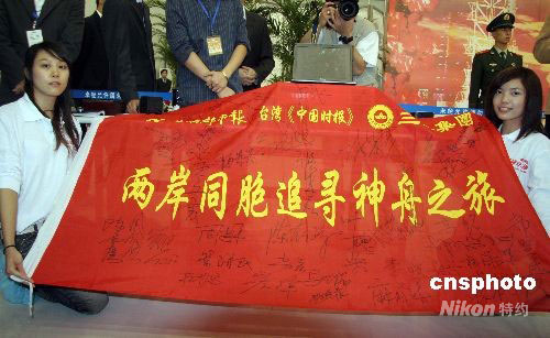 10月1日上午,神舟七號載人飛船返回艙在其誕生地——中國航天科技集團(tuán)公司所屬中國空間技術(shù)研究院舉行開艙暨搭載物交接儀式,伴隨三位中國航天員太空飛行六十八小時(shí)二十七分鐘的一批特殊“乘客”一一精彩亮相,隨后各歸其主。圖為來自福建、臺灣各七人組成的兩岸同胞追尋神舟之旅成員們,在開艙儀式上展示有“神七”任務(wù)各系統(tǒng)負(fù)責(zé)人簽名的旗幟,并現(xiàn)場播放隨“神七”飛天歸來的海峽兩岸民眾祝福錄音U盤。中新社發(fā) 孫自法 攝