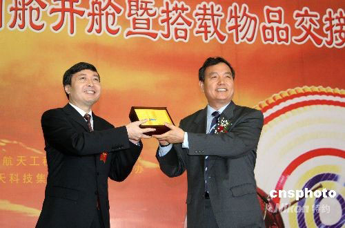 10月1日上午,神舟七號載人飛船返回艙在其誕生地——中國航天科技集團公司所屬中國空間技術(shù)研究院舉行開艙暨搭載物交接儀式,伴隨三位中國航天員太空飛行六十八小時二十七分鐘的一批特殊“乘客”一一精彩亮相,隨后各歸其主。圖為中國載人航天工程辦公室主任王文寶(右)福建省有關(guān)方面移交錄有海峽兩岸民眾祝福語音并隨“神七”飛天的U盤。中新社發(fā) 孫自法 攝