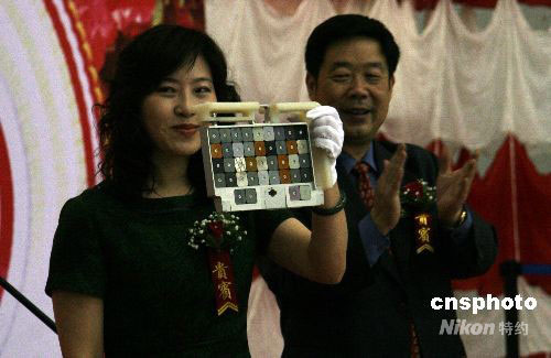 10月1日上午,神舟七號(hào)載人飛船返回艙在其誕生地——中國航天科技集團(tuán)公司所屬中國空間技術(shù)研究院舉行開艙暨搭載物交接儀式,伴隨三位中國航天員太空飛行六十八小時(shí)二十七分鐘的一批特殊“乘客”一一精彩亮相,隨后各歸其主。圖為中國載人航天工程總設(shè)計(jì)師周建平(右)向中科院光電研究院副院長、中國載人航天工程空間應(yīng)用系統(tǒng)總指揮高銘移交“神七”完成的固體潤滑材料外太空暴露試驗(yàn)裝置及樣品。中新社發(fā) 孫自法 攝
