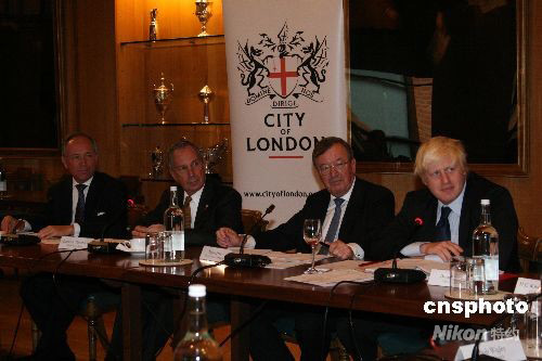 當(dāng)?shù)貢r(shí)間6日下午,紐約市長(zhǎng)邁克爾·布隆博格在倫敦金融城,與倫敦市長(zhǎng)鮑里斯·約翰遜及倫敦金融城的高層舉行圓桌會(huì)談,商討金融形勢(shì)。圖為布隆博格(左二)、約翰遜(右一)、倫敦金融城資源與政策委員會(huì)主席斯圖亞特·弗雷澤(右二)和副主席邁克爾·斯奈德(左一)。中新社發(fā) 李鵬 攝