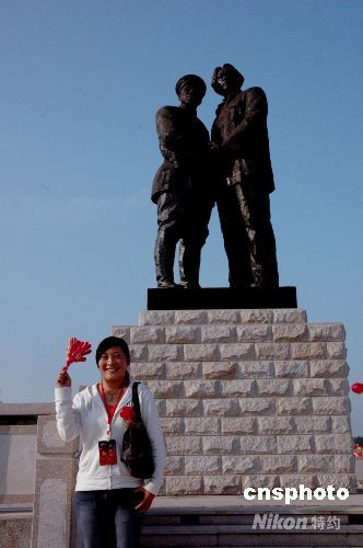 十月七日,一尊重五點(diǎn)四噸,高五點(diǎn)八米朱德和毛澤東會師的大型銅像,在井岡山龍市朱毛會師廣場揭幕,銅像吸引了眾多的中外游客觀賞和拍攝。中新社發(fā) 段長征 攝
