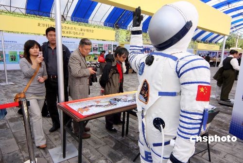 10月10日,“神七”模型和中國造“飛天”太空艙外航天服吸引眾多市民參觀拍照。當日,“太空禮贊·中國‘神舟’載人航天展覽”亮相北京地壇圖書節(jié)。據(jù)悉,按照1:5比例制作的‘神舟七號’飛船模型可謂是本次展覽的一大亮點,這也是該模型首次在公眾面前展示,同類模型目前只在北京航天飛行控制中心內(nèi)有一個。中新社發(fā) 吳芒子 攝