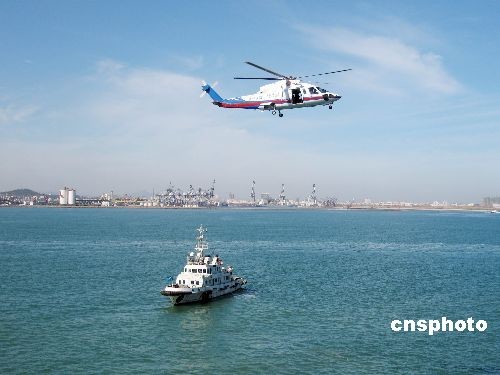 10月11日上午,中國交通運輸部煙臺海事局、北海救助局、北海第一救助飛行隊等部門在渤海灣聯(lián)合舉行客滾船?樟Ⅲw搜救演習(xí)。旅客從20多米高的客滾船上垂直下滑撤離和救助直升機從海上救起傷員直接空降醫(yī)院樓頂兩項是在中國內(nèi)地海上應(yīng)急搜救演練中首次使用,共有5艘船舶、1架直升機以及公安、消防、醫(yī)院、機場等方面的數(shù)百名搜救人員參加了演習(xí),重點演練了搜救組織指揮、客滾船旅客垂直撤離、救助船消防炮滅火等9個科目。中新社發(fā) 蔡紅文 攝