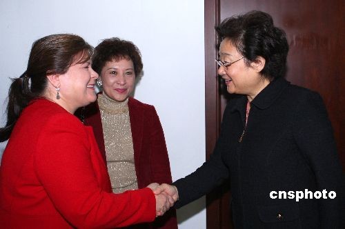10月20日,由國務(wù)院僑務(wù)辦公室和中國海外交流協(xié)會主辦的首屆國際禮儀培訓(xùn)班在北京開課。國務(wù)院僑辦主任李海峰歡迎并會見授課講師、美國前政府白宮高級禮賓官羅拉·埃福德。中新社發(fā) 廖文靜 攝