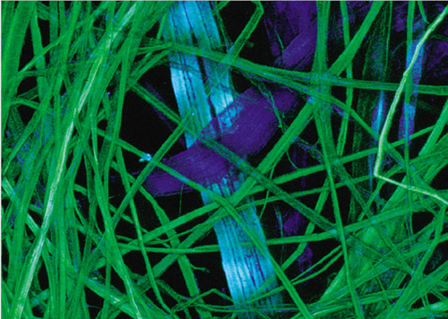 日本紙,查爾斯·卡茲勒克攝,放大100倍。圖片上展示的范圍比報(bào)紙上印刷的一個(gè)句號(hào)還小。拍攝技術(shù):共焦。