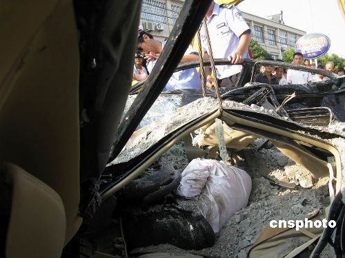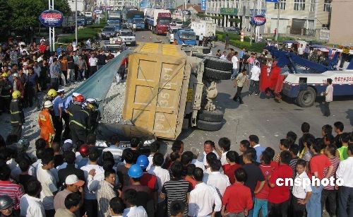10月21日下午14時(shí)左右,一輛滿載泥土的貨車在浙江省慈溪市蘆庵公路發(fā)生側(cè)翻事故,將一輛轎車?yán)卫螇鹤。蓢嵉哪嗤翉能嚿蟽A瀉而下,造成轎車司機(jī)死亡。目前,事故原因在進(jìn)一步調(diào)查中。中新社發(fā) 何蔣勇 攝