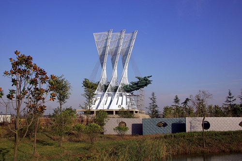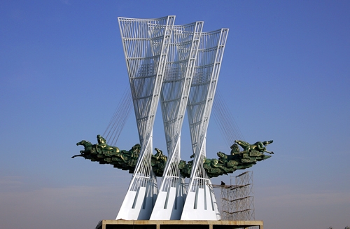 10月23日,在“運(yùn)河之都”江蘇省淮安市,一座象征張帆遠(yuǎn)航的景觀雕塑——“南船北馬”主體部分基本安裝完成!澳洗瘪R”雕塑位于寧淮高速公路淮安市南互通出入口處,主體由張力的風(fēng)帆和奔馳的車馬組成,整個造型似一艘巨駁,緊扣淮安“南船北馬、九省通衢”的歷史主題。作者:曹軍輝 張勇