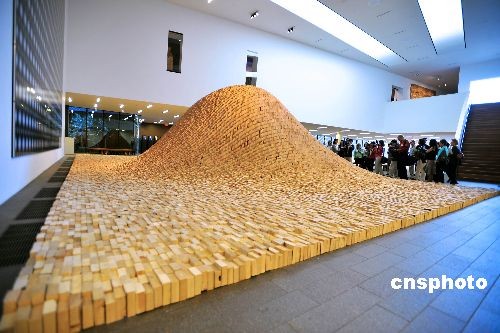 圖為林瓔的《2x4 風(fēng)景》,該作品長(zhǎng)36英尺,寬53英尺,高10英尺,重約30噸,由4萬(wàn)塊木板構(gòu)成,10個(gè)工人用了15個(gè)工作日建成。中新社發(fā) 陳鋼 攝