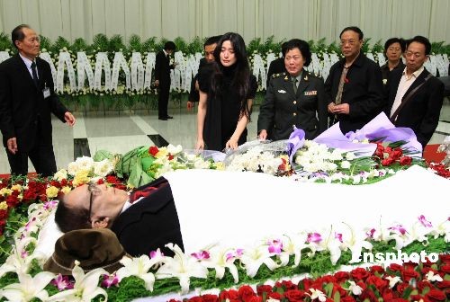 曾在謝晉導(dǎo)演拍攝的《女籃5號(hào)》里出演女主角、現(xiàn)已86歲高齡的老藝術(shù)家秦怡(中)也親自到場(chǎng),為老朋友送行。中新社發(fā) 湯彥俊 攝