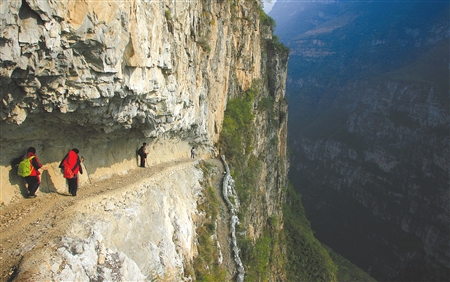 古路村小學(xué)的孩子們天天都會經(jīng)過懸崖上鑿出的上學(xué)路。