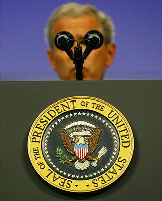 布什在美國海外退全軍人協(xié)會全國大會上發(fā)表講話時,麥克風恰好擋住了他的眼睛。作者:旺仔