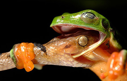 一只樹蛙(北美洲樹蟾科)與一條蛇進(jìn)行生死決斗。