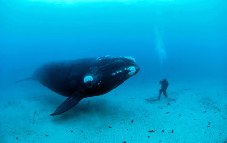 一頭南露脊鯨在新西蘭22米深的海底與一位潛水者相遇。