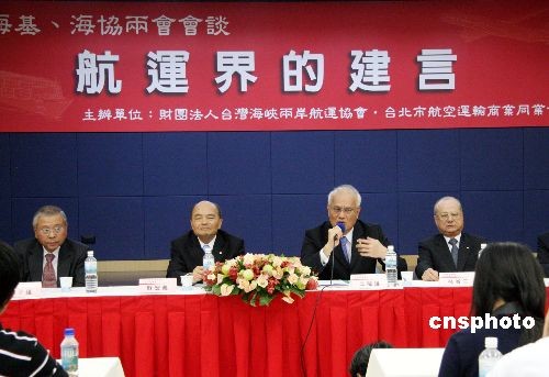 10月30日下午,臺灣?蘸竭\(yùn)業(yè)界代表由臺灣海峽兩岸航運(yùn)協(xié)會常務(wù)顧問、長榮集團(tuán)首席副總裁林省三牽頭,與臺灣領(lǐng)導(dǎo)人馬英九見面并遞交陳情書,希望即將在臺北登場的陳云林與;鶗麻L江丙坤會談能排除萬難,實(shí)現(xiàn)?罩焙,促進(jìn)兩岸經(jīng)貿(mào)發(fā)展,造福于民。隨后,他們在臺北舉行記者會,表示非常歡迎海協(xié)會會長陳云林訪臺,并期盼兩岸直航早日落實(shí)。中新社發(fā) 黃少華 攝