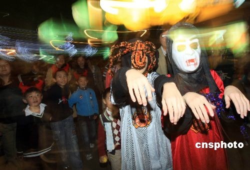 10月31日晚,蘇州宮巷一商家請(qǐng)來一群裝扮成“妖魔鬼怪”的演員在店門前表演節(jié)目,歡慶“萬圣節(jié)”。中新社發(fā) 王建康 攝