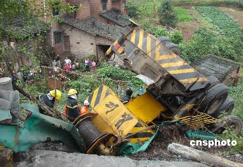 11月2日11時(shí)50分許,渝黔高速公路重慶至一品段10公里處,一輛長(zhǎng)江牌吊車因爆胎導(dǎo)致車輛失控,沖出護(hù)欄發(fā)生側(cè)翻,造成1人死亡,1人重傷。中新社發(fā) 張東清 攝