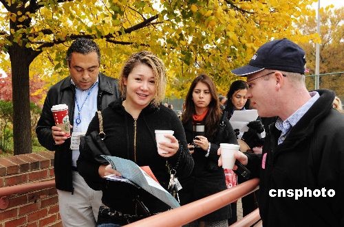 在臨近華盛頓的弗吉尼亞阿靈頓郡中心圖書館投票站,很多選民因為起得早,沒有吃早飯,此時來了兩位送餅干和熱咖啡的?墒,這兩位開口就問:你是奧巴馬的投票者么?一位女士說“Yes!”,于是馬上咖啡餅干免費(fèi)奉上。中新社發(fā) 邱江波 攝