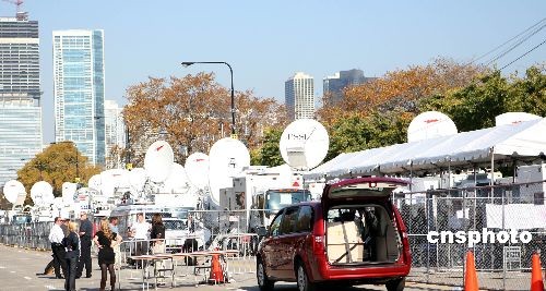 美國民主黨總統(tǒng)候選人奧巴馬四日晚將在芝加哥市的格蘭特公園舉行慶;顒印碜允澜绺鞯亓俣嗉颐襟w將報道這次活動。當日上日,公園周圍已停滿電視臺的衛(wèi)星轉(zhuǎn)播車。中新社發(fā) 李靜 攝
