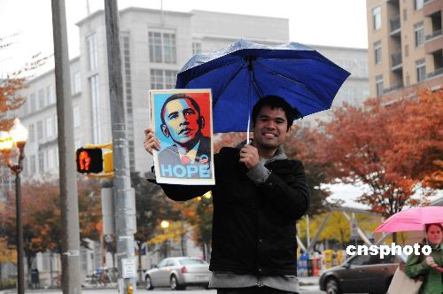 華盛頓街頭一位奧巴馬支持者舉著寫(xiě)有“希望”字樣的奧巴馬像,號(hào)召人們抓緊時(shí)間“顆粒歸倉(cāng)”,把奧巴馬送到白宮。