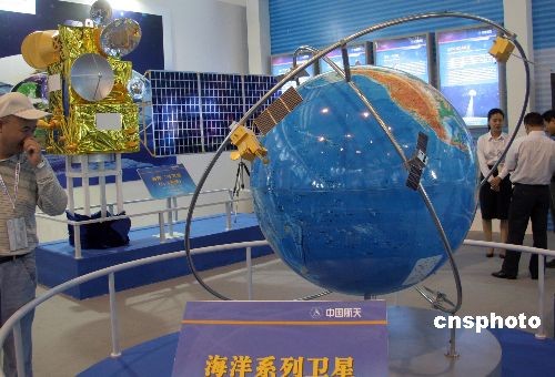 圖為中國(guó)航天科技集團(tuán)公司研制的海洋系列衛(wèi)星在珠海航展展出,左上為海洋二號(hào)衛(wèi)星模型。中新社發(fā) 孫自法 攝