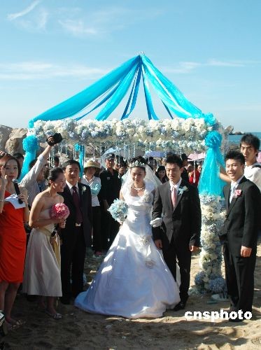 11月6日,2008北京奧運(yùn)會(huì)體操“全能王”在海南三亞著名的天涯海角景區(qū)的愛情廣場(chǎng)的沙灘上舉行盛大浪漫的婚禮,與新娘楊云經(jīng)過8年的愛情長(zhǎng)跑,終于走進(jìn)婚姻的殿堂。楊威和新娘楊云登上熱氣球,演繹空中浪漫。中新社發(fā) 尹海明 攝
