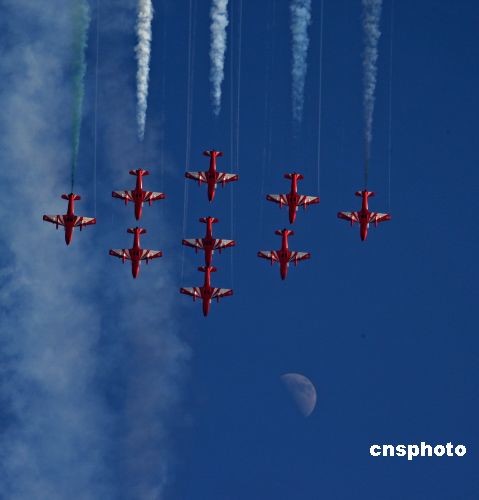 11月6日,印度空軍“陽光”飛行表演隊(duì)的9架飛機(jī)在第七屆珠!昂秸埂鄙蠟橛^眾作了數(shù)十個(gè)飛行科目表演。中新社發(fā) 譚超 攝
