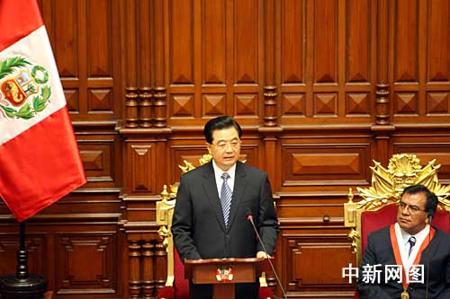 中國(guó)國(guó)家主席胡錦濤當(dāng)?shù)貢r(shí)間十一月二十日在秘魯國(guó)會(huì)發(fā)表題為《共同構(gòu)筑新時(shí)期中拉全面合作伙伴關(guān)系》的重要演講,就發(fā)展中國(guó)和拉美各國(guó)友好合作關(guān)系作了全面闡述。中新社記者 齊彬攝