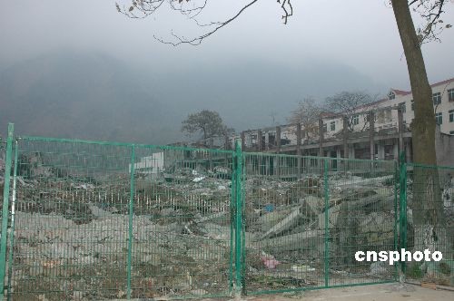 為尊重遇難學(xué)生的家長(zhǎng)意見,避免參觀者踩在逝者長(zhǎng)眠之地,11月21日,北川中學(xué)地震遺址前正在加裝綠色的圍欄。中新社發(fā) 肖龍聯(lián) 攝