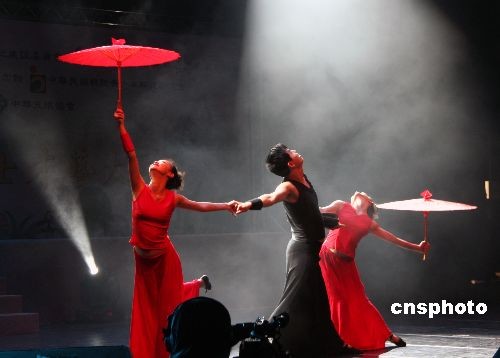 上海殘疾人藝術團的聾人舞蹈演員在晚會上表演舞蹈《紅黑傘》。中新社發(fā) 周兆軍 攝