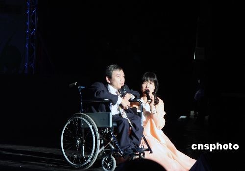 雙腿殘疾的劉銘(左)和雙目失明的朱萬花主持晚會。中新社發(fā) 周兆軍 攝