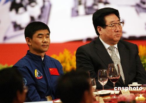 圖為神舟七號航天員翟志剛、景海鵬等在宴會上。