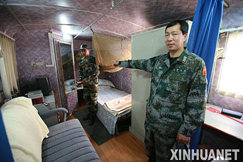 印方這次專門為中方兩位大校指揮官提供了兩輛移動(dòng)方艙居住,我參觀了其中的一輛方艙:十幾平米大小,里面設(shè)有簡(jiǎn)單臥室和會(huì)客間,空調(diào)、洗澡間、衛(wèi)生間一應(yīng)俱全,因?yàn)樘鞖廨^熱,僅小風(fēng)扇就裝了八、九個(gè)。