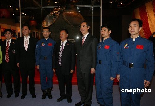 圖為香港政務(wù)司司長唐英年、神舟七號載人航天飛行赴港代表團團長暨中國載人航天工程副總指揮張建啟、神七航天員翟志剛、劉伯明、景海鵬等在返回艙前合影。中新社發(fā) 武仲林 攝
