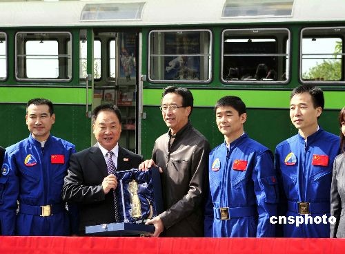 香港旅發(fā)局主席田北俊(中)向“神七”訪港代表團贈紀念品。