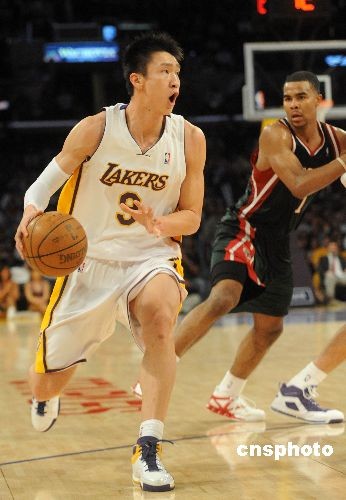 當(dāng)?shù)貢r(shí)間十二月七日晚,NBA洛杉磯湖人隊(duì)在主場以一百零五比九十二輕取雄鹿隊(duì),中國球員孫悅首度在NBA常規(guī)賽上登場,共取得四分。在終場前五分十三秒,孫悅上場,每當(dāng)他拿球,整個(gè)斯坦普斯體育場內(nèi)歡聲雷動(dòng)。中新社發(fā) 張煒 攝