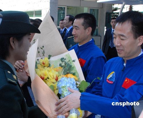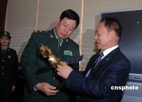 圖為代表團(tuán)團(tuán)長張建啟向駐澳門部隊(duì)司令員王玉仁贈(zèng)送神舟七號飛船模型。中新社發(fā) 畢永光 攝