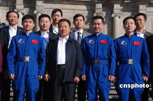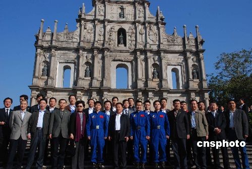 圖為代表團(tuán)團(tuán)長張建啟及航天員翟志剛、劉伯明、景海鵬等在牌坊前合影留念。中新社發(fā) 畢永光 攝
