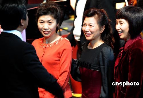 圖為神七三位航天英雄的妻子在譚晶音樂會結(jié)束后跟主持人交談。