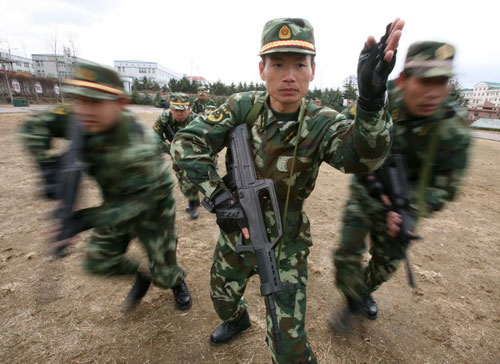 防暴隊員在進行戰(zhàn)術(shù)合成課目訓(xùn)練