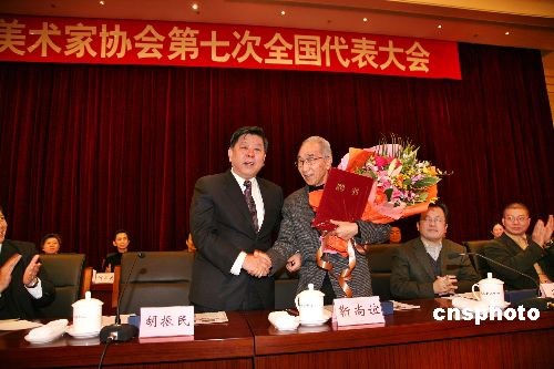 中國文聯(lián)黨組書記、副主席胡振民給新當選的中國美協(xié)榮譽主席靳尚誼頒發(fā)聘書。中新社發(fā) 王保勝 攝