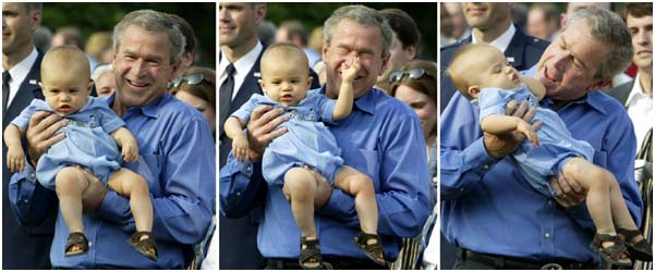 在白宮傳統(tǒng)的一年一度夏季野餐會上,美國總統(tǒng)布什在逗玩國會議員的兒子。